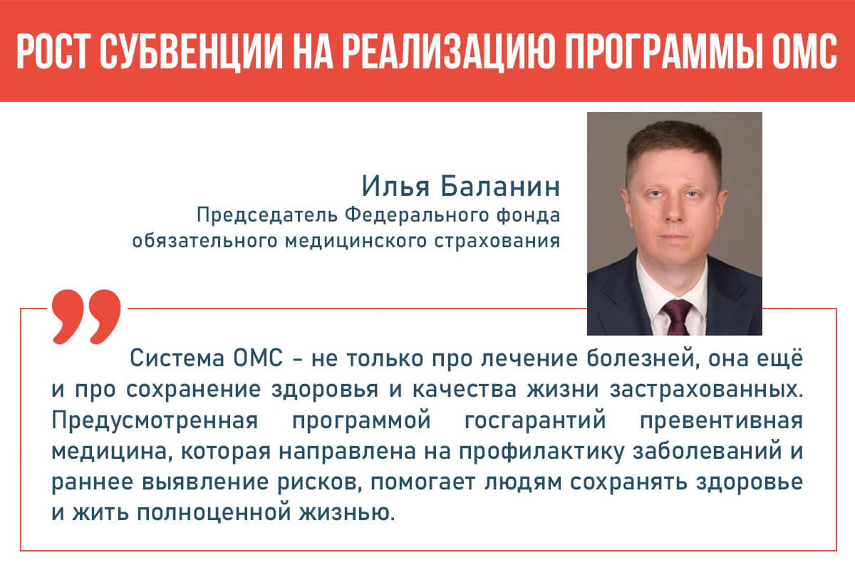 «Ежегодное увеличение финансирования обеспечивает рост объемов и доступность бесплатной качественной медпомощи вне зависимости от территории проживания застрахованного», - отметил Председатель ФОМС Илья Баланин.