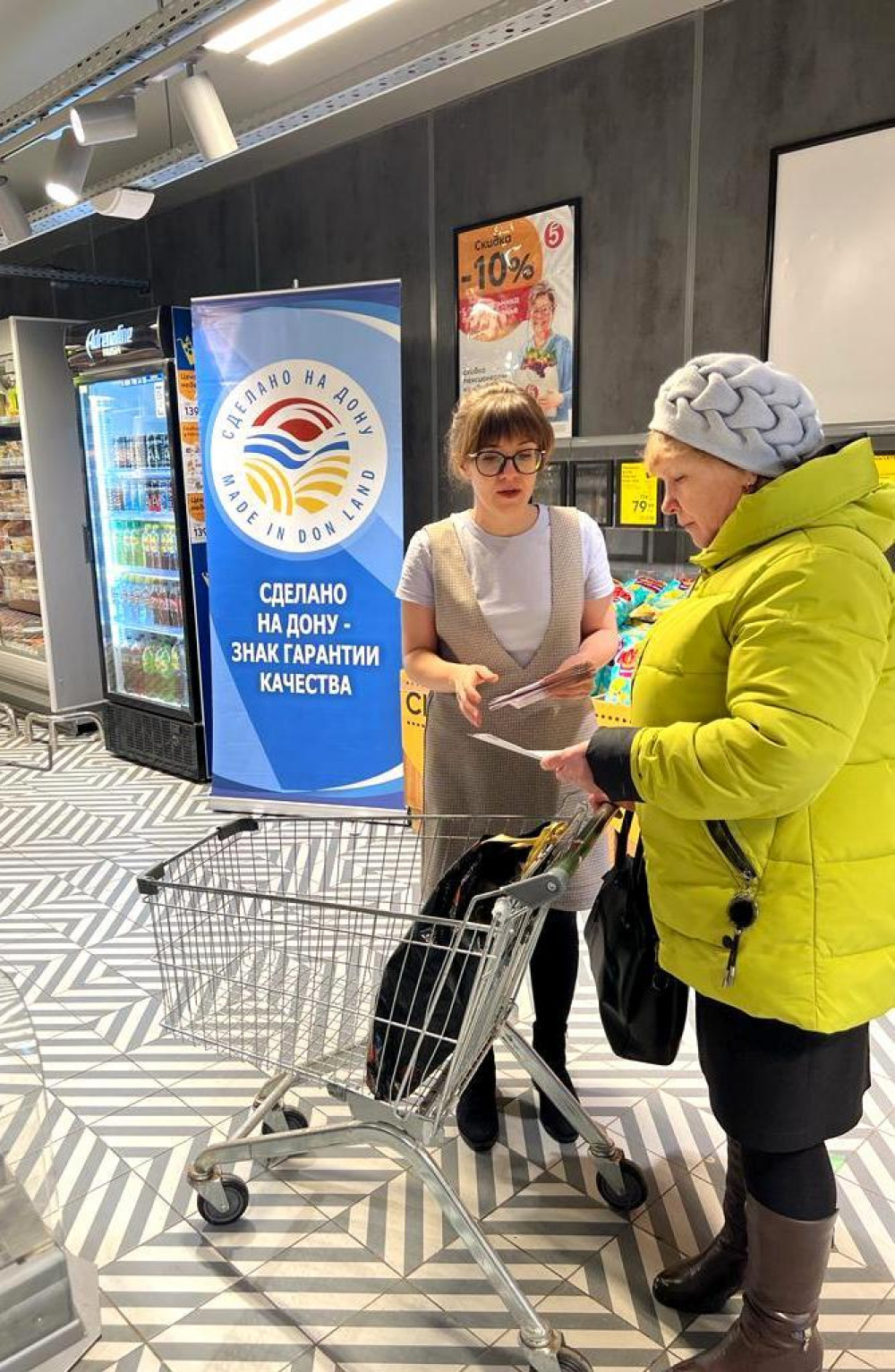 Они рассказали покупателям о системе добровольной сертификации «Сделано на Дону», вручили информационные памятки, наглядно показали продукцию, отмеченную региональным знаком. Также посетителям объяснили, как можно найти продукцию, произведенную в Ростовской области, ориентируясь на информационные ценники с логотипами, визуализирующими донскую продукцию.