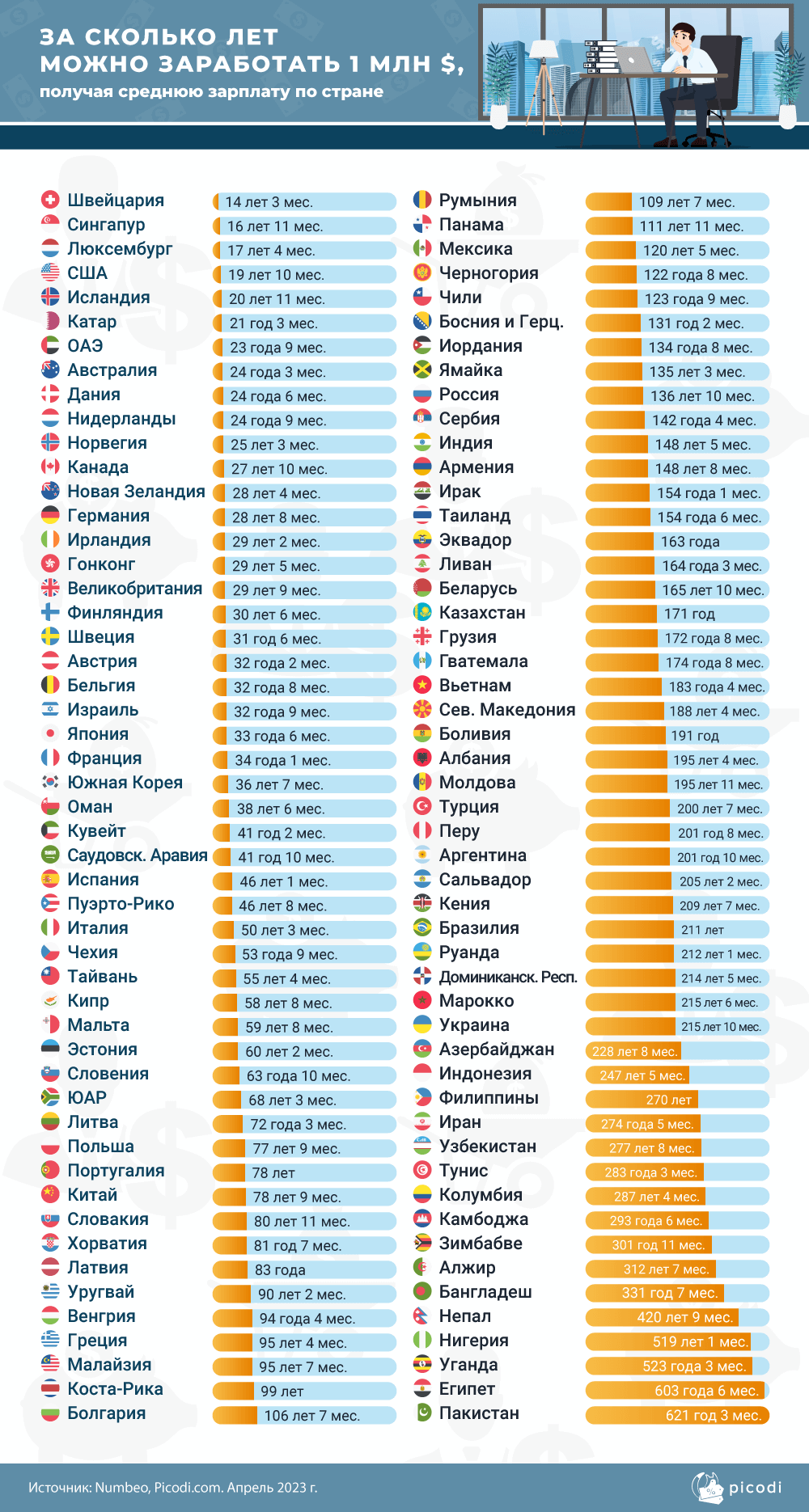 Ростовская область, 16 апреля 2023. DON24.RU. Аналитики подсчитали, за сколько лет жители разных стран могут заработать один миллион долларов. Данные опубликованы на сайте picodi.