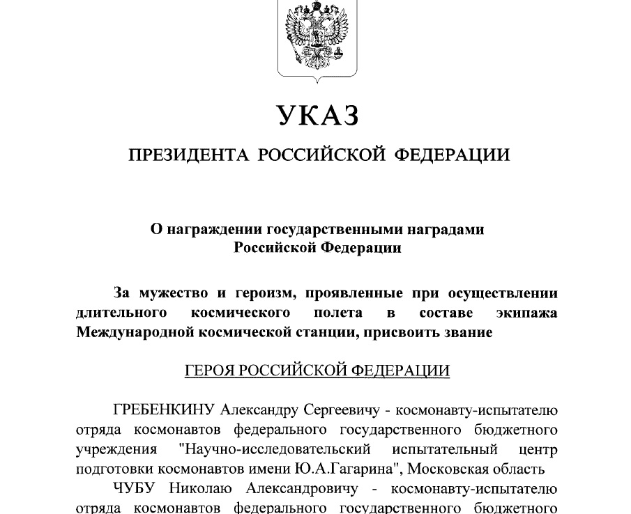 Этим же указом Владимир Путин присвоил Николаю Чубу почётное звание "Лётчик-космонавт Российской Федерации.