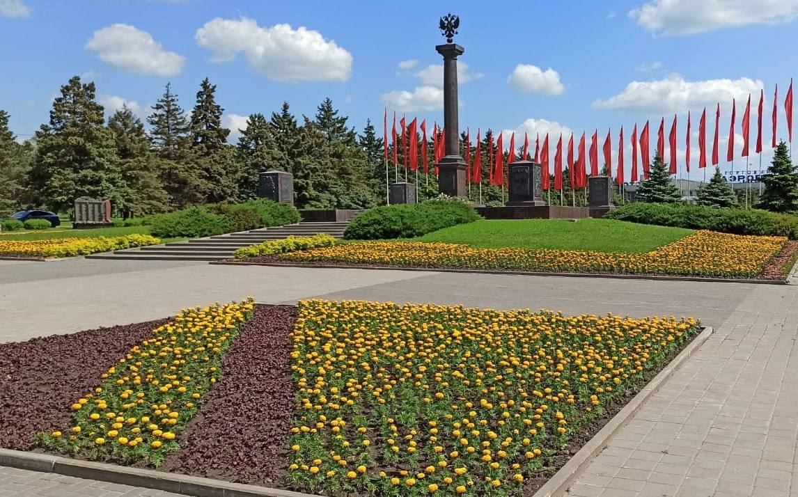 Первые посадили к празднованию Дня Великой Победы. Мемориалы, памятные места украсили красная пеларгония, тагетес, колеус, цинерария.