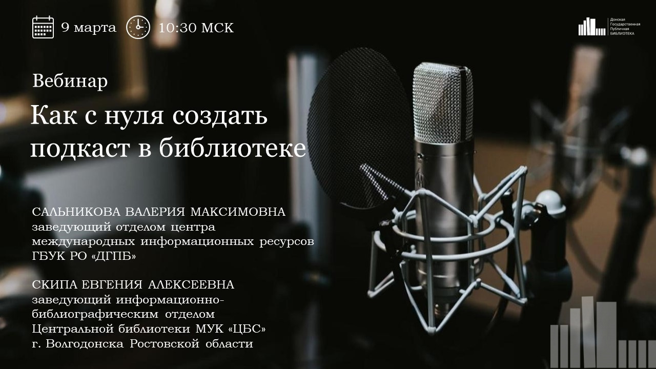 В рамках вебинара участники узнают историю подкастинга, изучат специфику и основные форматы подкастов, рассмотрят этапы разработки, размещения и продвижения библиотечных подкастов на примере Донской государственной публичной библиотеки и Центральной библиотеки МУК «ЦБС» г. Волгодонска.