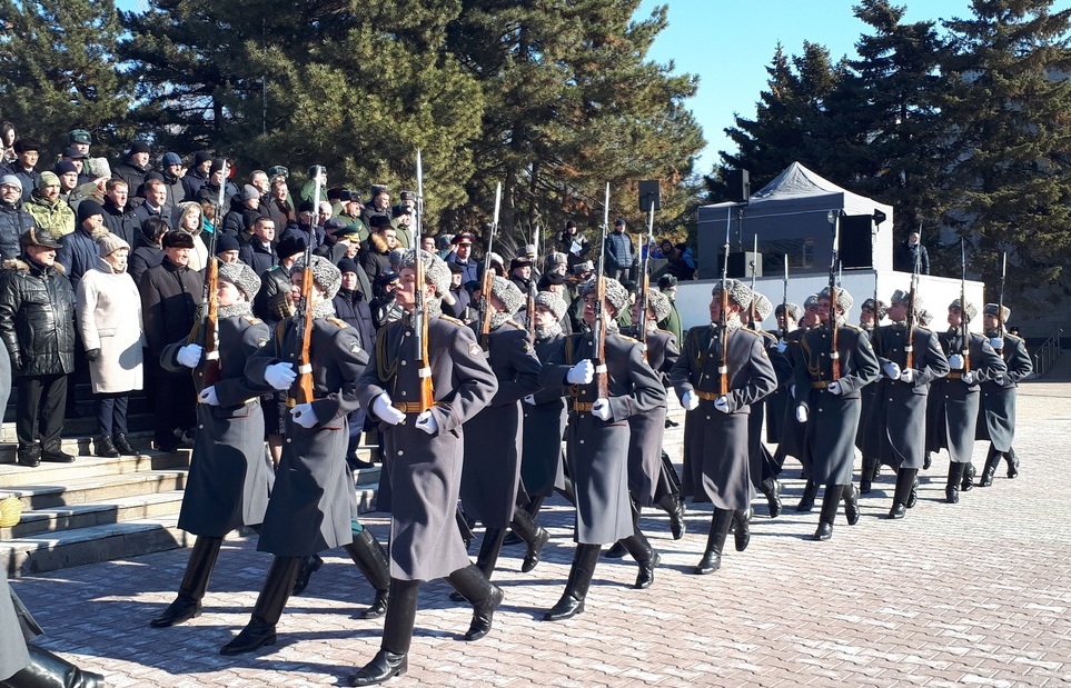 Торжественным маршем у мемориала прошли рота почетного караула и военный духовой оркестр Южного военного округа.