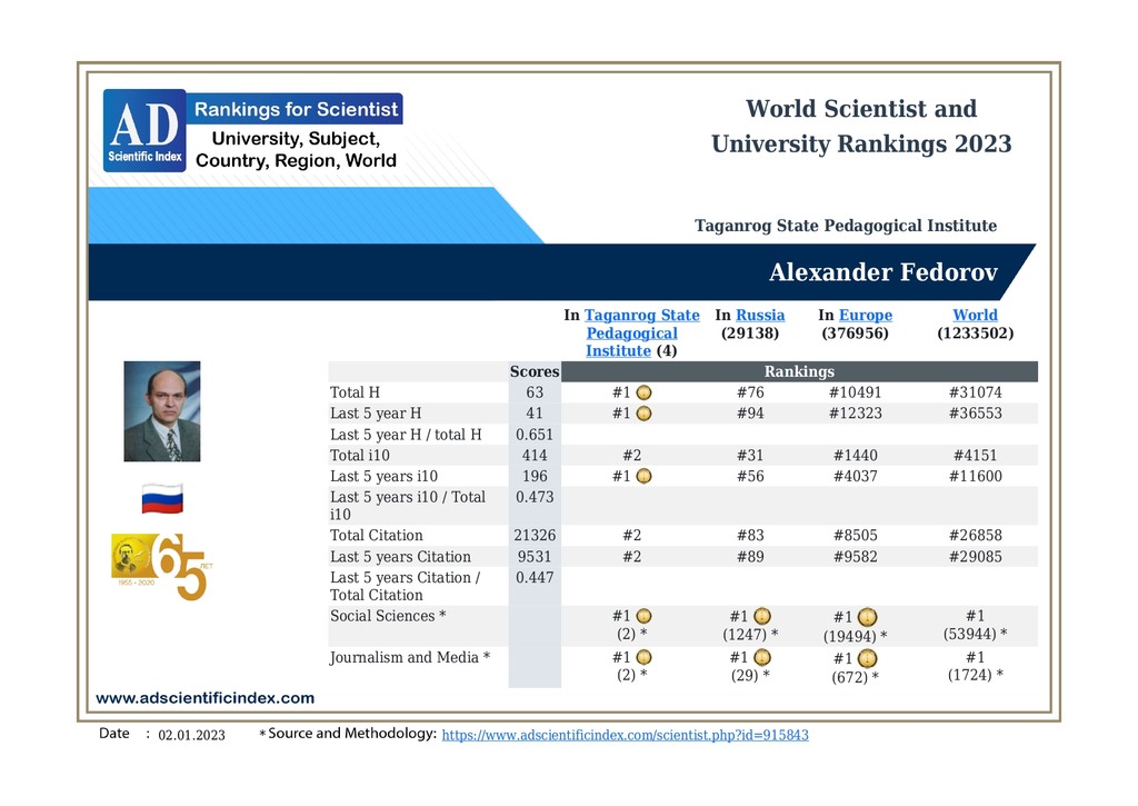 Профессор кафедры психолого-педагогического образования и медиакоммуникации А.В. Федоров занял первое место в мире и Европе в международном рейтинге ученых по индексу цитирования научных трудов по двум разделам: «Журналистика и медиа», «Социальные науки».