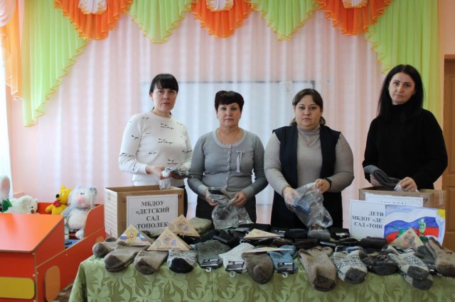 27 января сотрудники МБДОУ «Детский сад «Тополек» присоединились к Всероссийской акции «Тепло для героя» в поддержку Вооруженных Сил Российской Федерации в рамках направления «Долголетие для всех» проекта партии «Единая Россия» «Старшее поколение», подготовили теплые вязанные изделия (носки, перчатки) и передали исполнительному секретарю Обливского местного отделения Всероссийской политической партии «Единая Россия» Потапову Валентину Васильевичу.