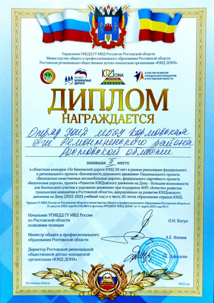 12 апреля 2023 года в Районном Доме культуры в ст. Кагальницкой прошел зональный этап областного конкурса резервных и основных отрядов ЮИД «По безопасной дороге ЮИД 50 лет». Школьники 14 образовательных учреждений Сальской зоны Ростовской области представили жюри свои программы, посвященные безопасности дорожного движения и юбилею организации.