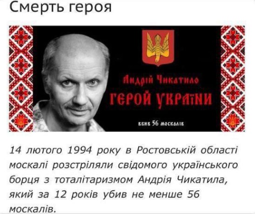 «14 февраля 1994 года в Ростовской области москали расстреляли ярого украинского борца с тоталитаризмом Андрея Чикатило, который за 12 лет убил не меньше 56 москалей», – говорится в публикации бандеровцев.