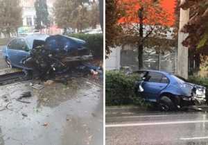 Автомобиль буквально «намотало» на опору уличного освещения В центре города Шахты легковая машина влетела в столб.