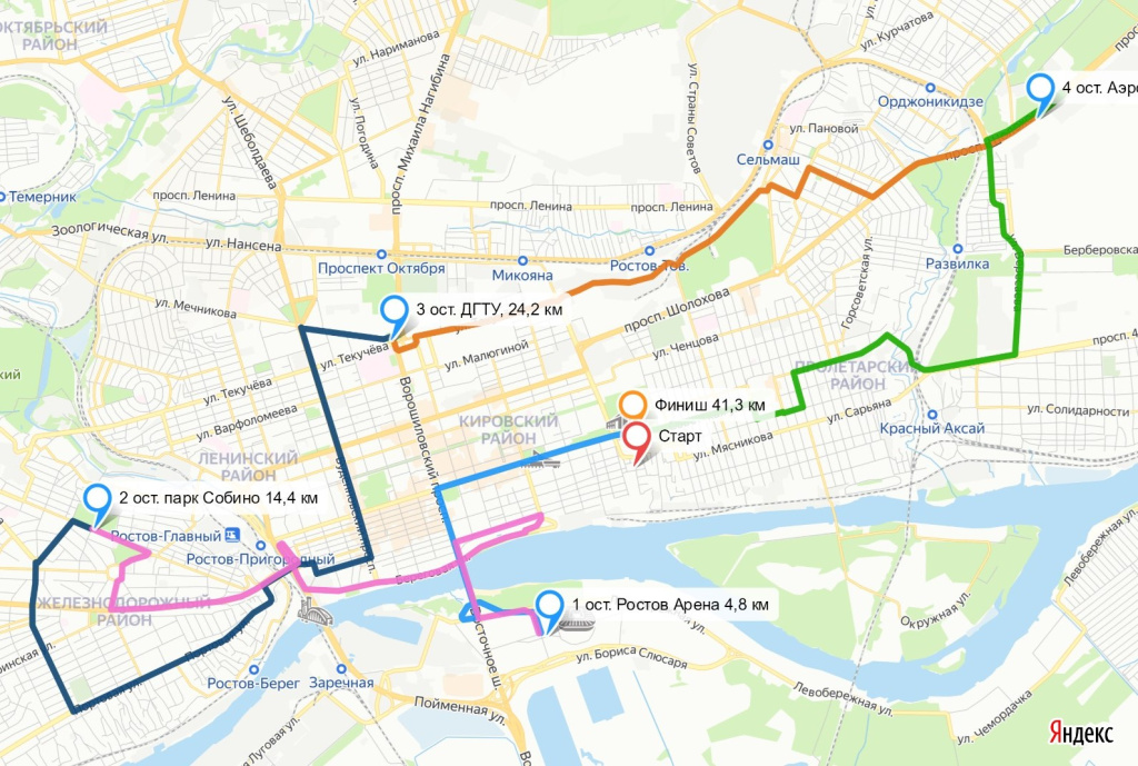Западный пешеходно-транспортный проезд стадиона «Ростов Арена» – Ворошиловский мост – ул. Седова – пр. Богатяновский Спуск – ул. Нижнебульварная – ул. Береговая – пр. Сиверса – подъем на пр. Стачки – пр. Стачки – ул. Спартаковская – ул. Верещагина – ул. Профсоюзная – парк им. А. Собино (остановка 25 минут)