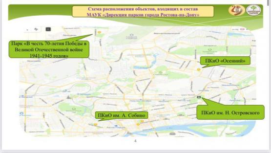 На начальном этапе в состав дирекции вошли парки «Осенний», имени А. Собино и «В честь 70-летия Победы в Великой Отечественной войне 1941-1945 годов».