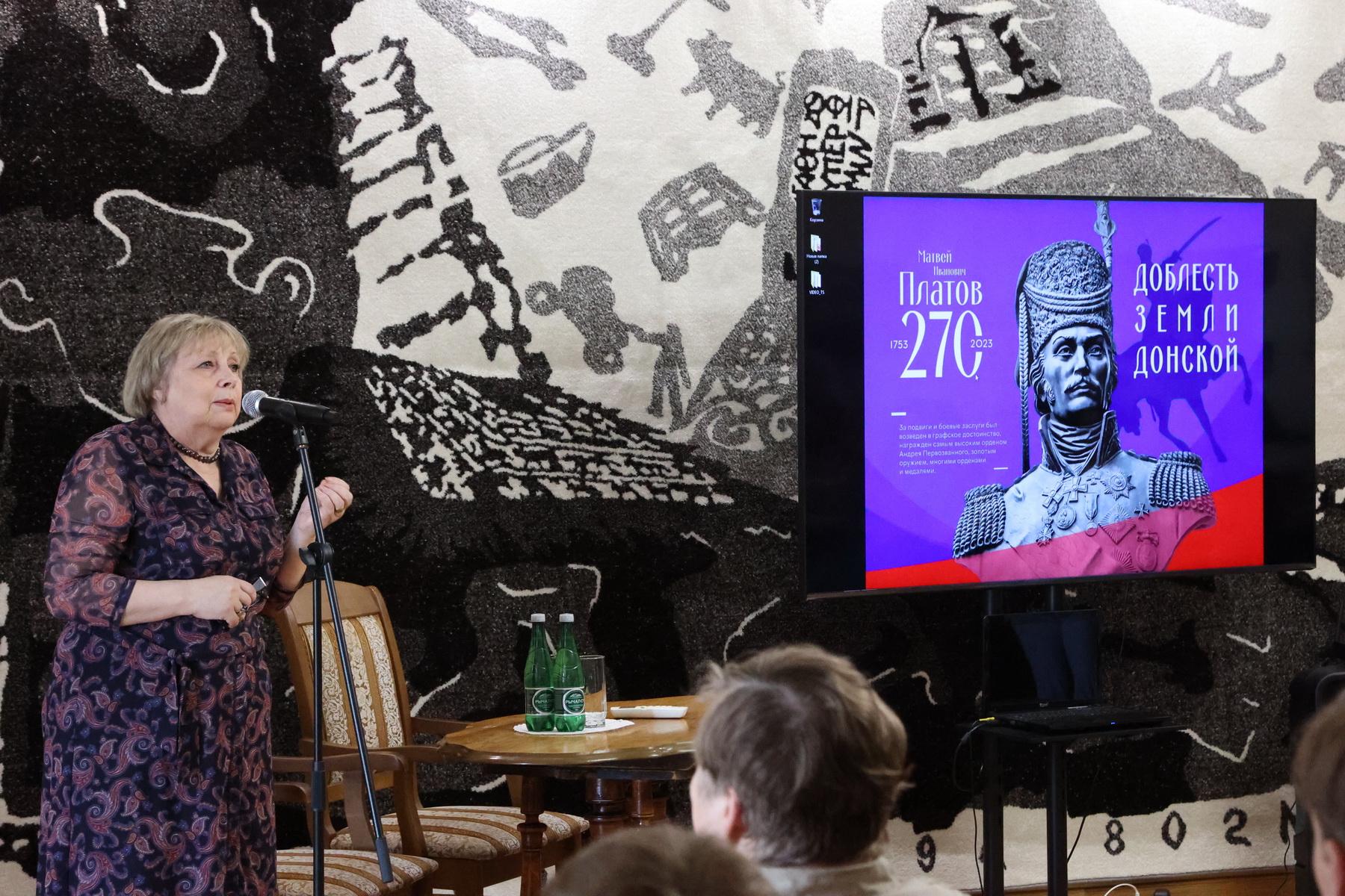 В рамках празднования в Таганроге 270-летия со дня рождения атамана Платова во Дворце Алфераки состоялась творческая встреча с автором документального фильма «Казачьи вёрсты 1812» Любовью Сурковой.