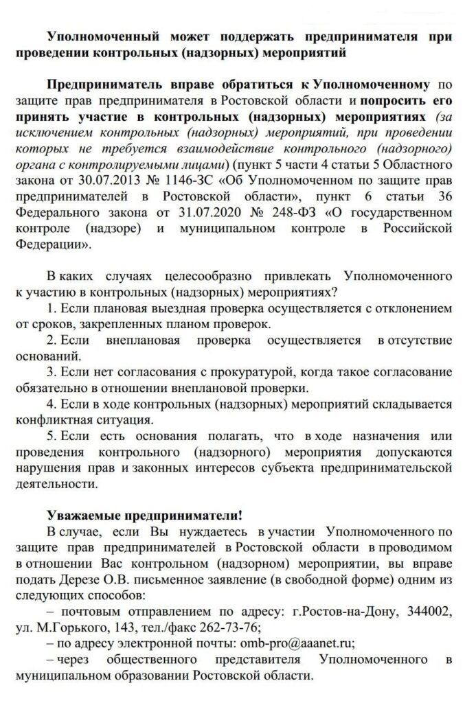 Уважаемые предприниматели! В случае, если Вы нуждаетесь в участии Уполномоченного по защите прав предпринимателей в Ростовской области в проводимом в отношении Вас контрольном (надзорном) мероприятии,