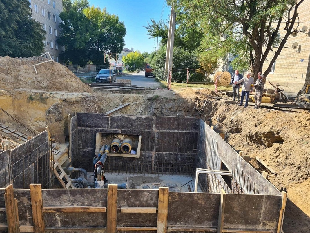 В соответствии с техническим заданием к контракту, на данный момент выполнены работы по разработке котлована, демонтажу трубопроводов горячего водоснабжения и отопления, разборке кирпичной кладки камер, каналов, компенсационных ниш, углов поворота вручную с очисткой кирпича, а также демонтажу сборных бетонных и железобетонных строительных конструкций. Была залита подбетонка под котлован, установлена опалубка под плиту днища, выставлены маяки, поддерживающий каркас, и проводится вязка арматуры.