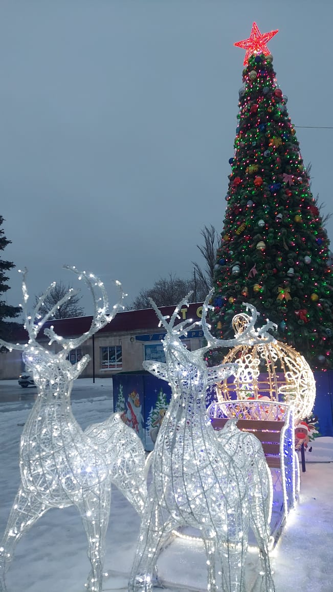 Яркими огоньками засверкала не только новогодняя елка, но и окружающие деревья, и новая сцена. Сказочные олени и новогодний шар, установленные возле зеленой красавицы завершили праздничное убранство.