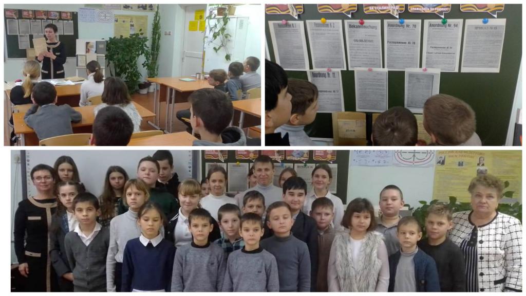 На уроке были представлены архивные документы периода оккупации, которые сохранились в Государственных архивах Ростовской области. Из них ребята узнали о тех требованиях, которые предъявлялись к мирным жителям оккупационных территорий. На пожелтевших страницах сохранившихся сочинений учеников города Ростов-на-Дону, которые были свидетелями злодеяний фашистов, всплывают страшные картины грабежей, убийств, разрушений. Вниманию учащихся также были представлены документы районного архива периода Великой Отечественной войны, которые повествуют о восстановлении разрушенного хозяйства и доблестном подвиге тружеников тыла.