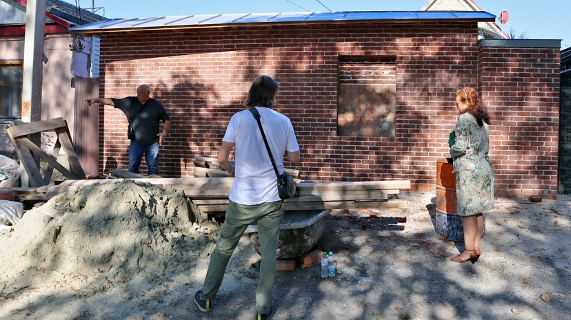 С предпринимателем Михаилом Потапенко, силами которого сооружалась стилизованная стена дома, и одним из авторов проекта Юрием Скворцовым были рассмотрены общестроительные и проектные вопросы. Сегодня стена практически готова, осталось лишь «отбить» её снизу декоративным поребриком. На площадке перед стеной будет уложена тротуарная плитка, устроены две небольшие клумбы. Прилегающую территорию с подходящей к дому дорогой планируется заасфальтировать.