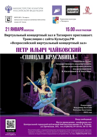Трансляция будет вестись с «Всероссийского виртуального концертного зала» сайта Культура.РФ. Таганрожцам покажут спектакль-балет Государственного академического театра классического балета под руководством Н. Касаткиной и В. Василёва (режиссеры Владимир Василёв, Наталия Касаткина, 2022 год). Начало в 15.00, вход свободный.