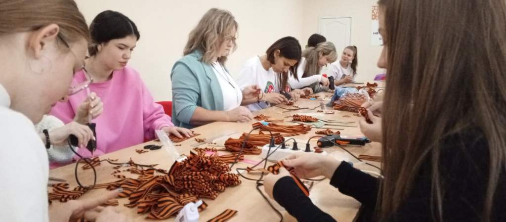 В Волгодонске одно из нужных и полезных дел фестиваля дарения #МЫВМЕСТЕ состоялось в Добро. Центре (Центр «Сила Добра» Волгодонского техникума энергетики и транспорта). Волонтёры культуры — мастерицы центра «Берегиня» дворца культуры «Октябрь» провели для добровольцев ВТЭТ, а также их подшефного отряда школы № 11 мастер-класс по изготовлению брошей с георгиевскими лентами.