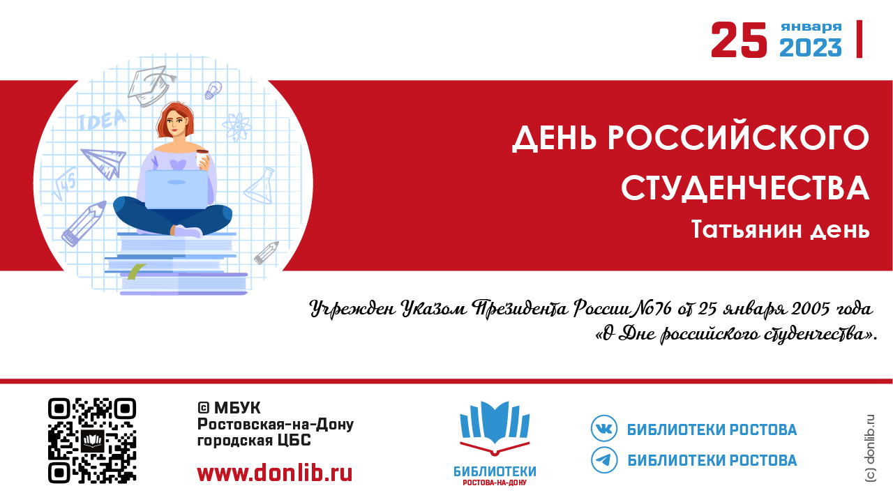 Библиотека имени С. А. Есенина приглашает на познавательный час «Татьянин день». 25 января в России отмечается как «День российского студенчества». В этот день поздравляют учащихся и преподавателей ВУЗов. Наиболее одарённых и самых прилежных студентов награждают почётными знаками. Лучшие педагоги вузов также получают особые грамоты и поощрения. А как появился этот праздник и почему его ещё называют Татьянин день? Об этом расскажем на мероприятии будущим студентам – старшеклассникам школы №17. А ещё покажем на страницах видеопрезентации «Куда поступать?» какие институты и университеты есть в Ростовской области.