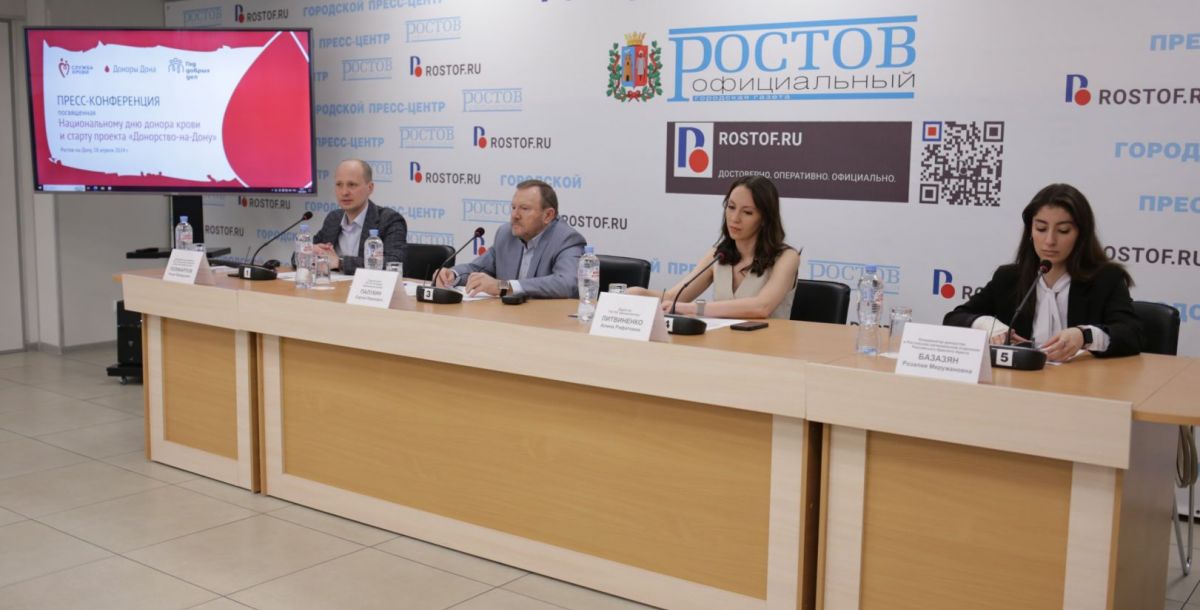 Накануне Национального дня донора крови в пресс-центре «Ростов официальный» состоялась пресс-конференция, посвященная донорству в Ростовской области. Участие в мероприятии приняли главный врач ГБУ РО «Станция переливания крови» Сергей Палухин, исполнительный директор АНО «Южный центр развития донорства костного мозга» Роман Поликарпов, директор ГАУ РО «Донволонтер» Алина Литвиненко и координатор донорства в Ростовском региональном отделении Российского красного Креста Розалия Базазян. Спикеры рассказали о работе областной Службы крови, развитии донорского движения в регионе, а также презентовали проект «Донорство-на-Дону».