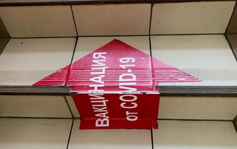 Фото: Наклейка "Вакцинация от COVID-19" на ступеньке, кадр из архива 1rnd
