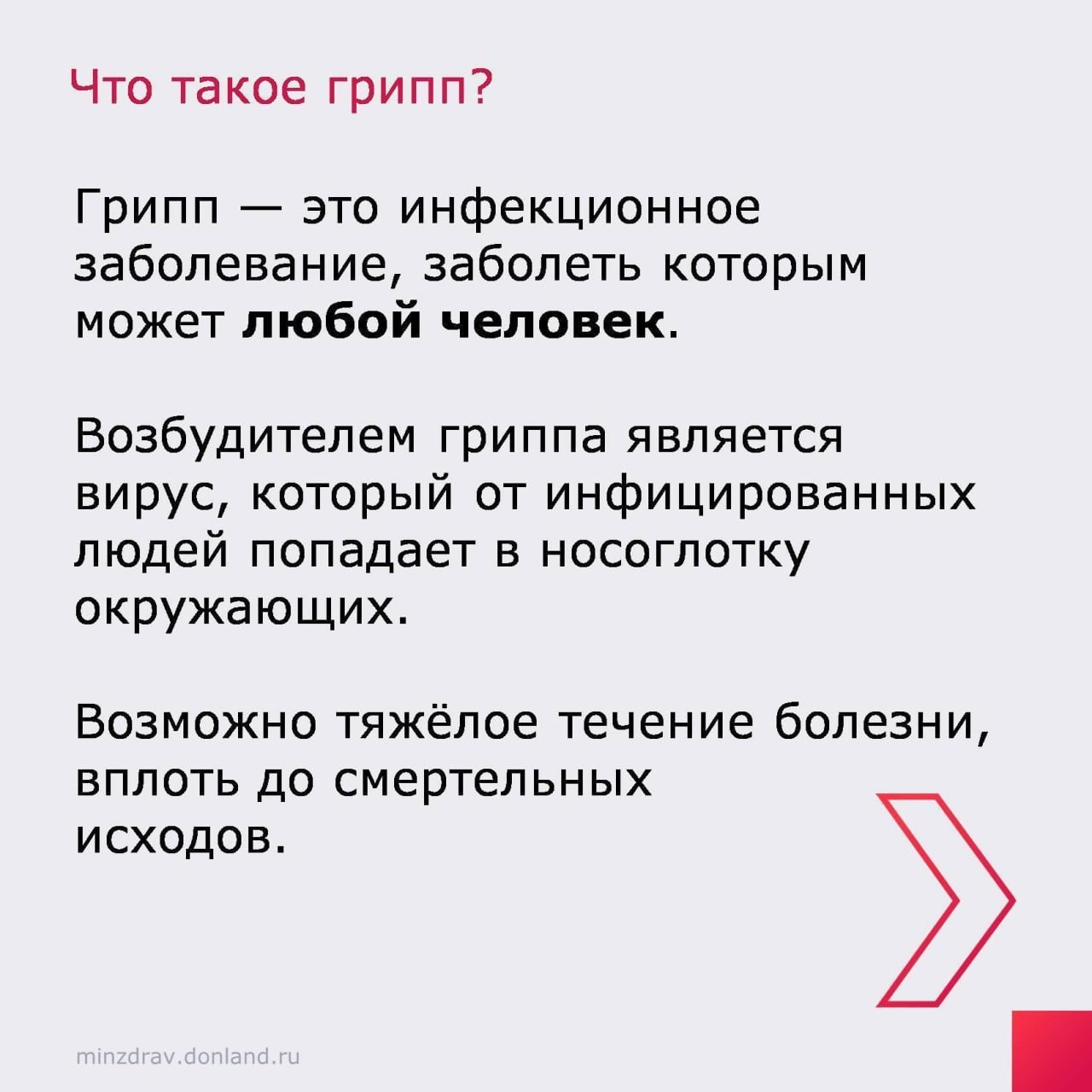 В Ростовской области продолжается вакцинация от гриппа. Чтобы избежать массового заражения, жителям Дона рекомендуется пройти вакцинацию. Предлагаем ознакомиться с карточками Минздрава РО https://t.me/mzro61 , в которых кратко даны ответы на вопросы о симптомах, особенностях, осложнениях и профилактике гриппа.