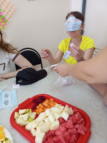 Получателям социальных услуг социально - реабилитационного отделения дневного пребывания было предложено поучаствовать в занятии вкусовой терапией. Для этого был приготовлен разнообразный набор фруктов и овощей для определения участниками игры их вкуса и названия. Каждому поочередно одевалась повязка на глаза и предлагался выбранный фрукт или овощ. Игра интриговала участников, веселила, а иногда и заставляла сосредоточиться.